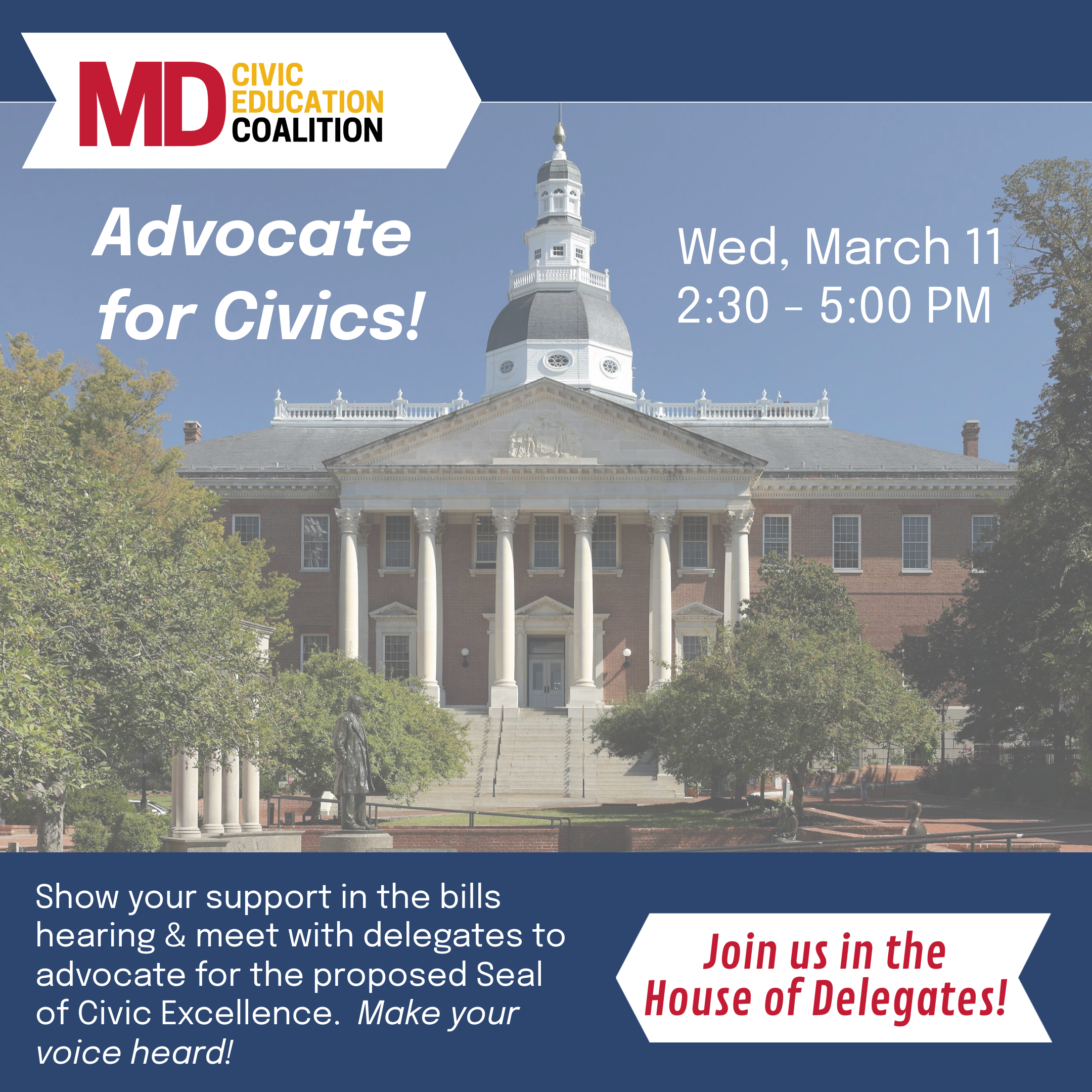 During Civic Learning Week, we will gather at the Maryland General Assembly on Wednesday, March 11 from 2:30–5:00 PM for an advocacy visit focused on strengthening civics education, with special attention to civic seals. Civic seals recognize students who demonstrate civic knowledge, skills, and engagement, and they signal that participation, service, and democratic responsibility are valued statewide.
